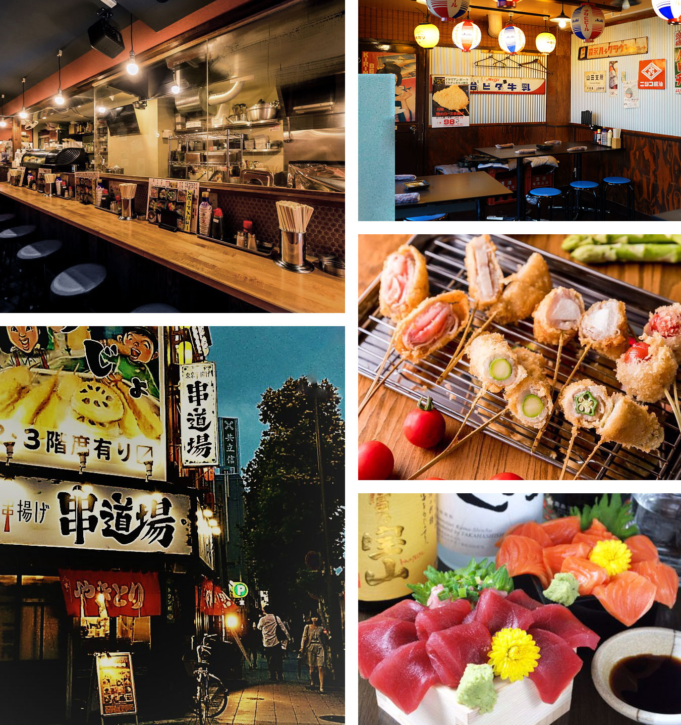 揚げたての串揚げが30種以上、串焼きや海鮮料理まで豊富なメニューをリーズナブルな価格で楽しめます。店内はタイムトリップしたような昭和の面影を残す雰囲気。